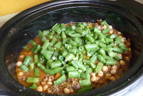 On returning, Slice some green runner beans blanche in boiling salted water add this to the slow cooker, open a tin of chick peas (you can use steeped ones but I find the tinned ones work very well) and add this, add 330 ml of full fat yoghurt and a good sprinkling of dried (or chopped fresh) mint and coriander leaves. Give it all a good stir and cook for another hour.